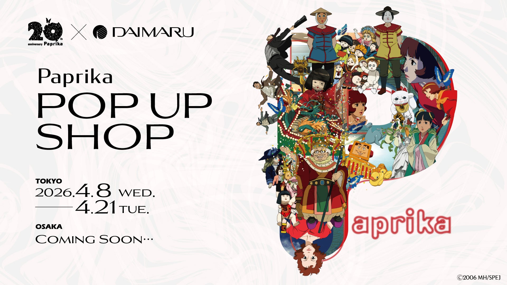 株式会社ウエニ貿易(代表取締役社長 : 宮上光喜)は、公開20周年を迎えた今 敏監督のアニメーション映画『パプリカ』とのコラボレーションによるアパレル&ライフスタイルアイテムを展開するポップアップショップを、4/8(水)~4/21(火)まで、大丸東京店にて開催いたします。