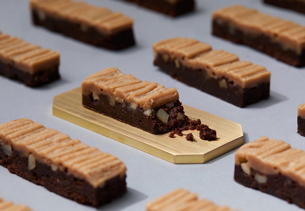 じゅわっとジューシーなビタークーベルチュール生地に、コクのある欧州マロンをきめ細やかにしぼりました。間に敷かれたマカダミアナッツがアクセント。栗とショコラが濃厚にとろけあう、モンブラン・ブラウニーです。