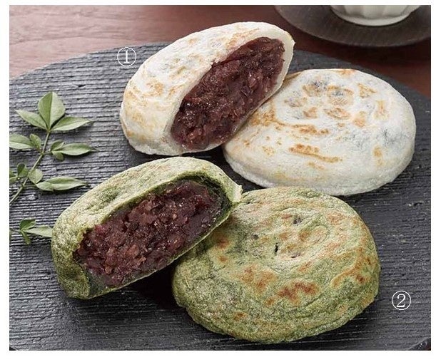 【通期】[福岡]かさの家①梅ヶ枝餅②よもぎ梅ヶ枝餅(5個、1包)各751円 実演
