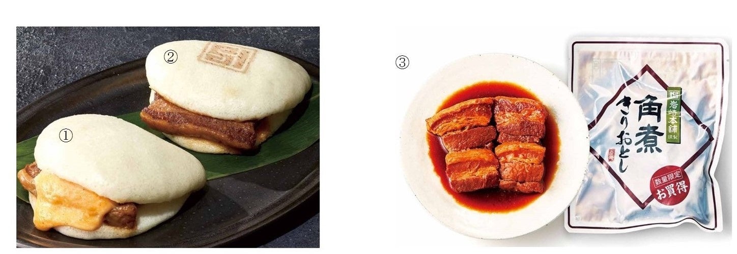 ②長崎角煮まんじゅう(5個入、1袋、冷凍)2,501円 ③特別ご提供品 角煮きりおとし(180g、