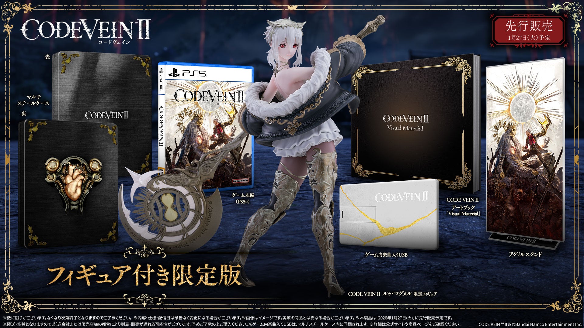 └ゲーム本編/CODE VEIN II ルゥ・マグメル 限定フィギュア/CODE VEIN IIアートブック「Visual Material」/マルチスケールケース/アクリルスタンド/ゲーム内楽曲入りUSB
