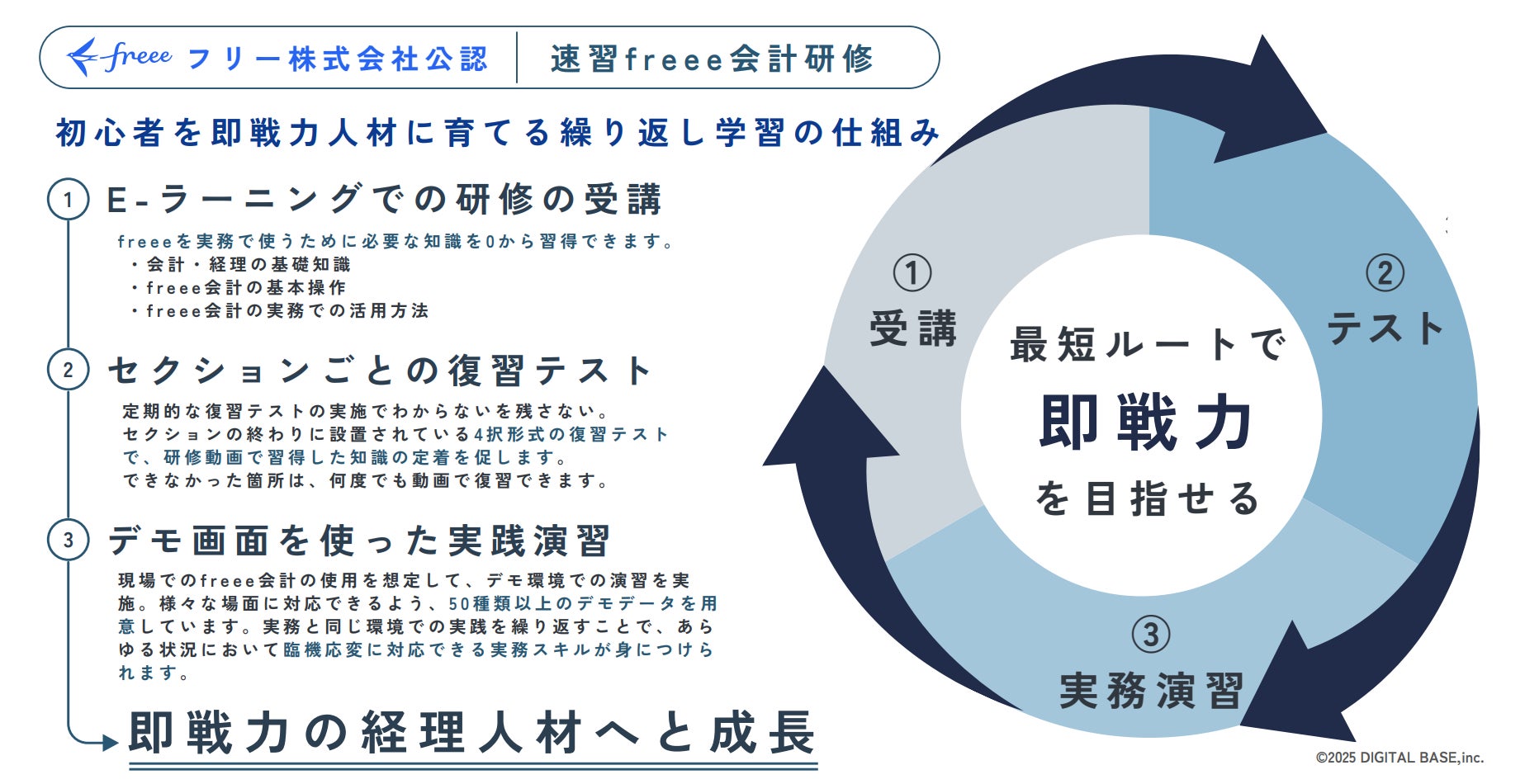 「速習freee会計研修」はDIGITAL BASEが提供・freeeが監修する、DX会計人材の育成をトータルサポートする研修プログラムです。受講者はe-learningを通じた座学研修、バーチャル環境上での実務演習、テスト受講を行い、1ヶ月程度の期間で完結します。freee会計を導入したものの活用しきれていない事務所や自己流の操作に不安を持つ方を主な対象としています。