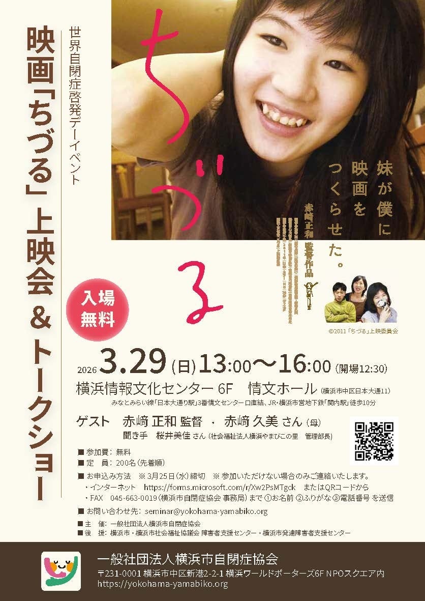 自閉スペクトラム症の女性・ちづるさんとその家族の日常を丁寧に描いたドキュメンタリー映画『ちづる』の上映会を開催します。上映後には、監督であるお兄様とお母様をお迎えし、映画制作当時から現在に至るまでの生活や思いを語っていただきます。