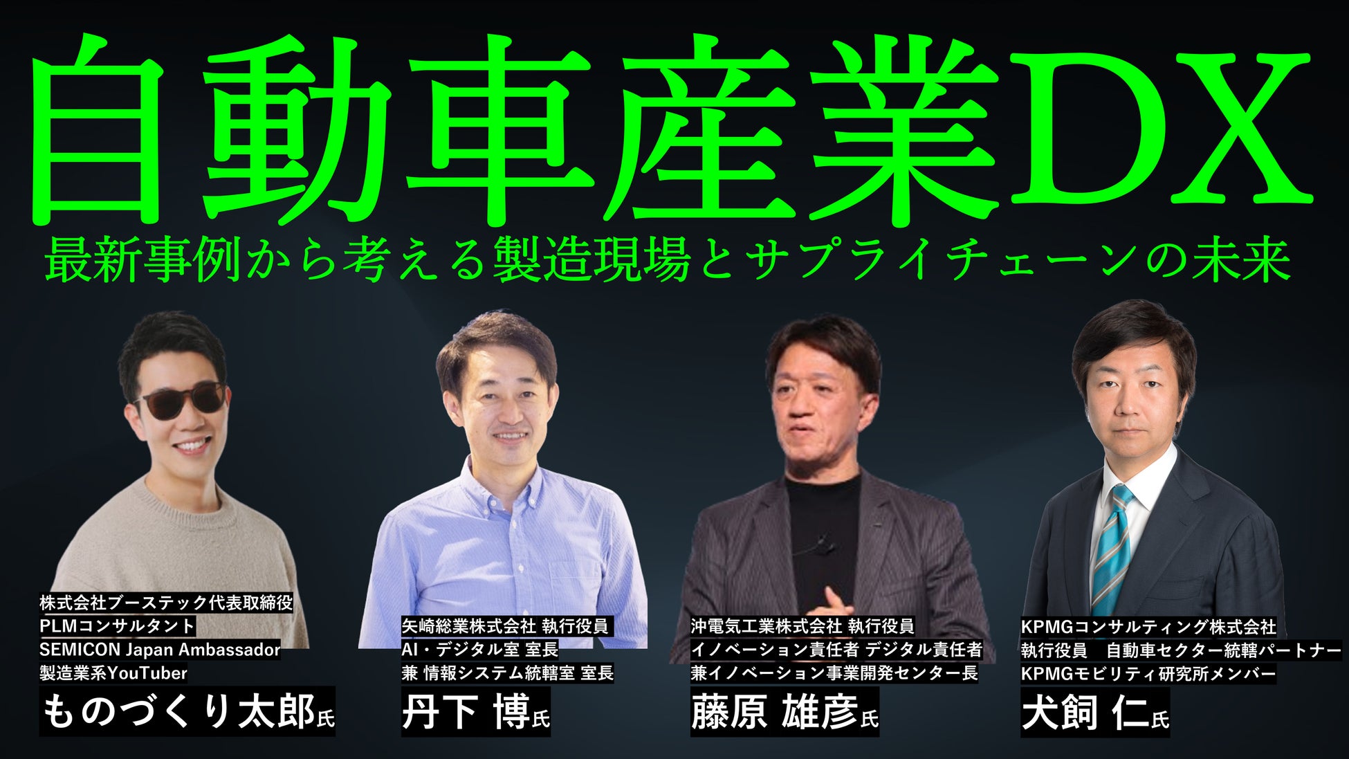 基調講演では、製造業系ユーチューバーのものづくり太郎氏が海外自動車メーカーへの現地取材で得た最新動向をリポート。特別講演では矢崎総業、沖電気工業のデジタル責任者が最新の取り組みを紹介し、自動車産業に精通するKPMGコンサルティングの犬飼仁氏が今後の展望を解説します。