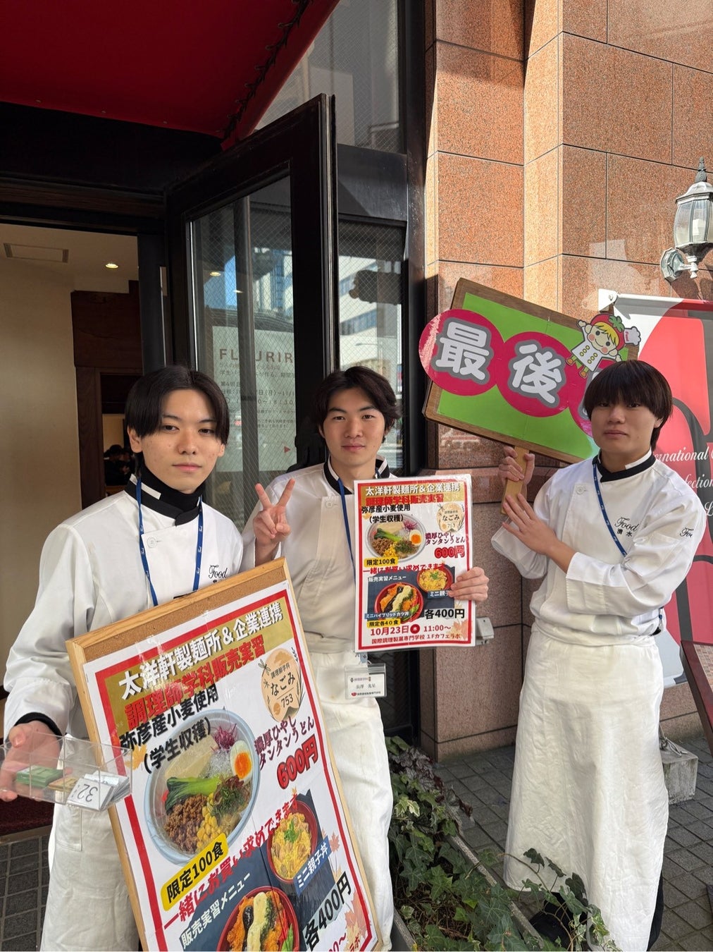 NSGグループ 学校法人 国際総合学園 国際調理製菓専門学校(以下「本学」、新潟県新潟市 校長:椎谷一幸)は、10月23日(木)に調理師養成課程1年生の調理師学科の学生が弥彦の小麦を使用したうどん「冷やしタンタンうどん」を作って販売を行いました。