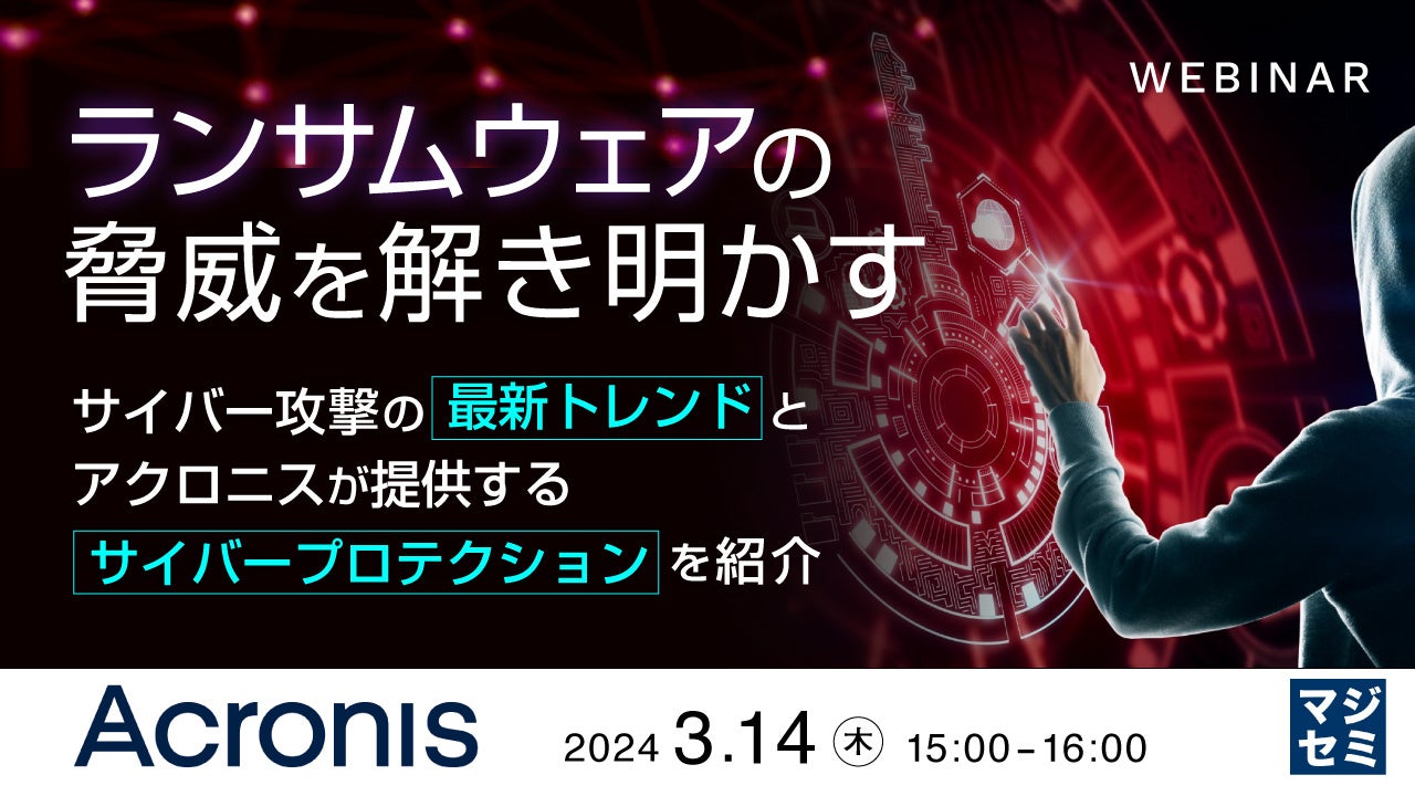 ■EDRも取り入れて全方位のランサムウェア対策を実現 本セミナーでは、最新のサイバー攻撃トレンドと対策、そしてアクロニスがどのようにこれらの課題に応えるのかを具体的にご紹介します。ランサムウェア攻撃からの防御とレジリエントな回復、その実現を後押しするアクロニスのソリューションもご紹介予定です。 サイバー攻撃への対策に不安を抱えている企業・組織の担当者の方は、ぜひご参加ください。