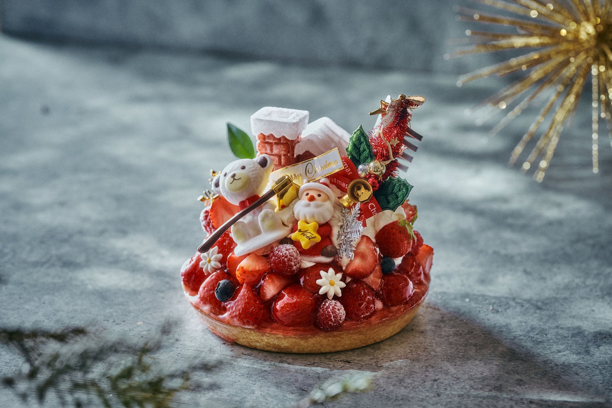 香ばしいアーモンドをたっぷり練り込んだタルト生地に、バニラ香るカスタードを重ね、みずみずしい苺やベリーをこんもりと。透明感のあるナパージュで艶やかに仕上げ、ホリデーの小さなオーナメントをあしらいました。断面まで赤が映える華やかさで、テーブルのセンターピースにもぴったりの一品です。