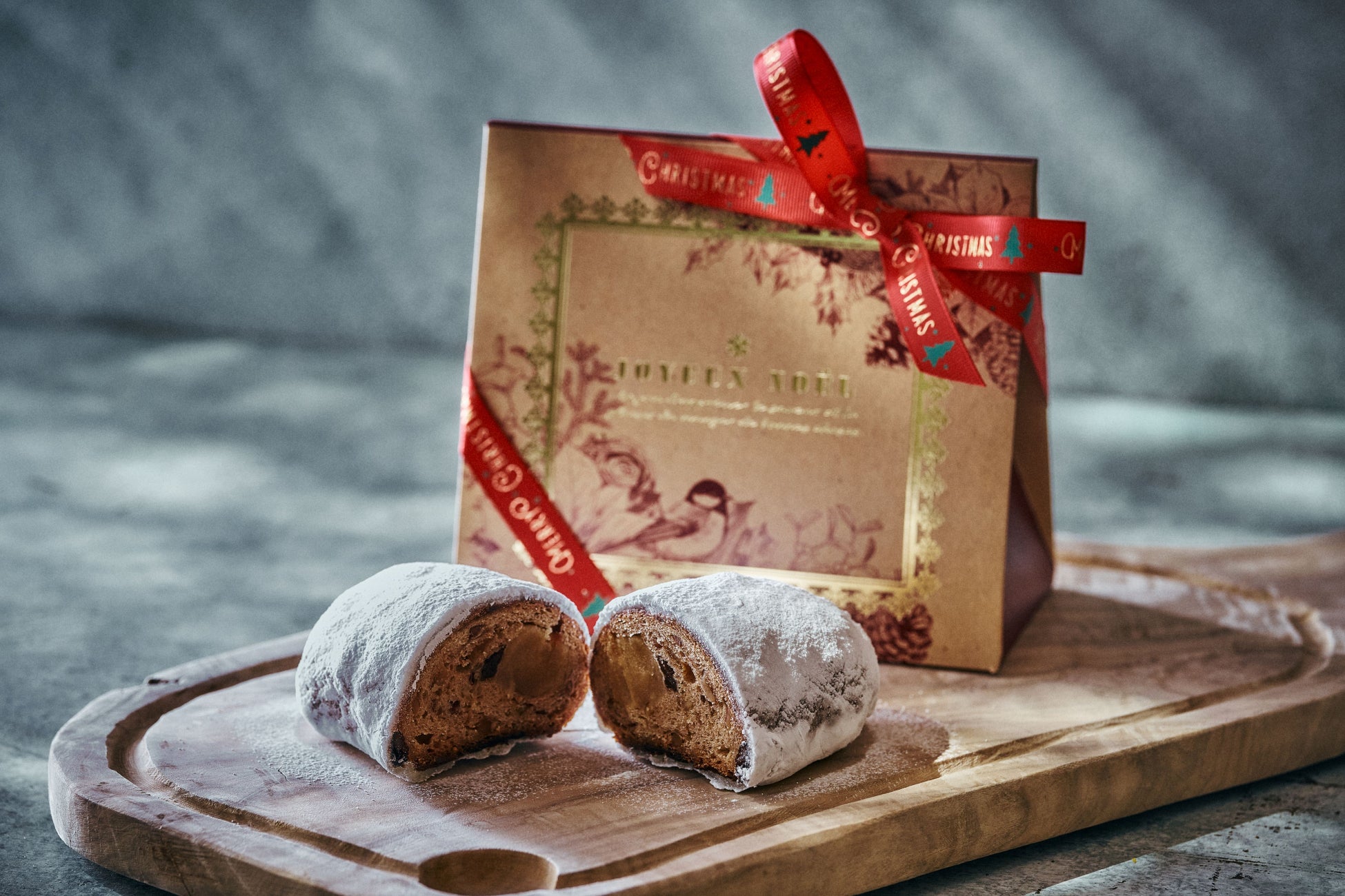 洋酒につけたドライフルーツとナッツをたっぷり練り込んだ生地をしっとりと焼き上げ、バターで包み込んだ一品。日に日に生地となじむ熟成の変化を楽しめます。パティシエ竹中のオリジナルレシピで作られたシュトーレンは、「1年間おつかれさま」「ありがとう」「来年もよろしく」という気持ちが込められています。
