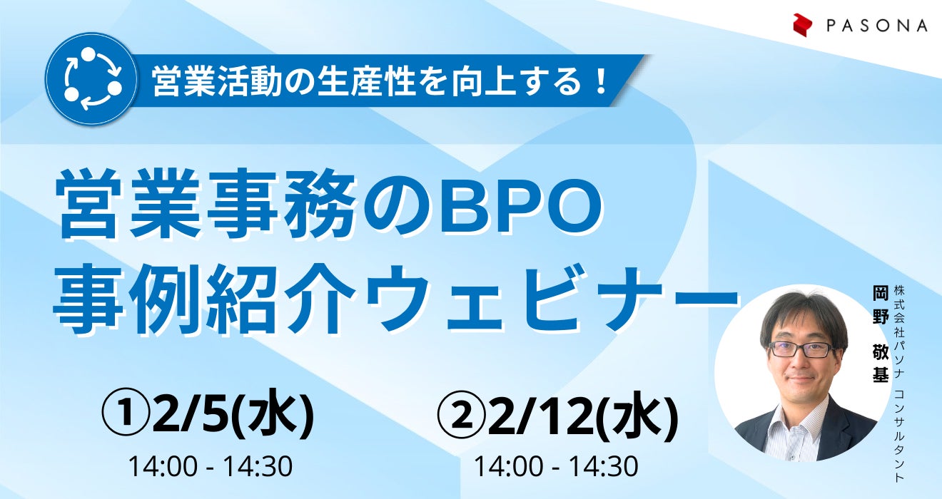 株式会社パソナは、営業管轄の役員・部長クラス、営業推進・企画、経営企画ご担当を対象に、『営業活動の生産性を向上する!営業事務のBPO事例紹介ウェビナー』を2月5日(水)、2月12日(水)に開催いたします。