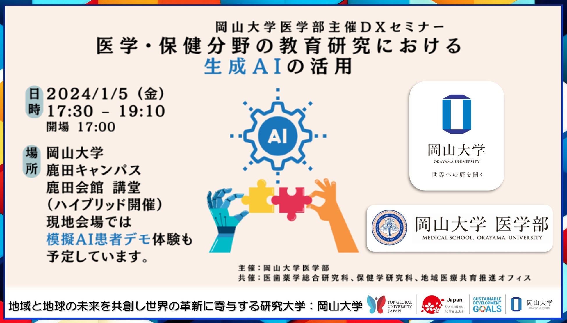 【岡山大学】岡山大学医学部主催 DXセミナー「医学・保健分野の教育研究における生成 AI の活用」〔1/5,金 ハイブリッド開催〕