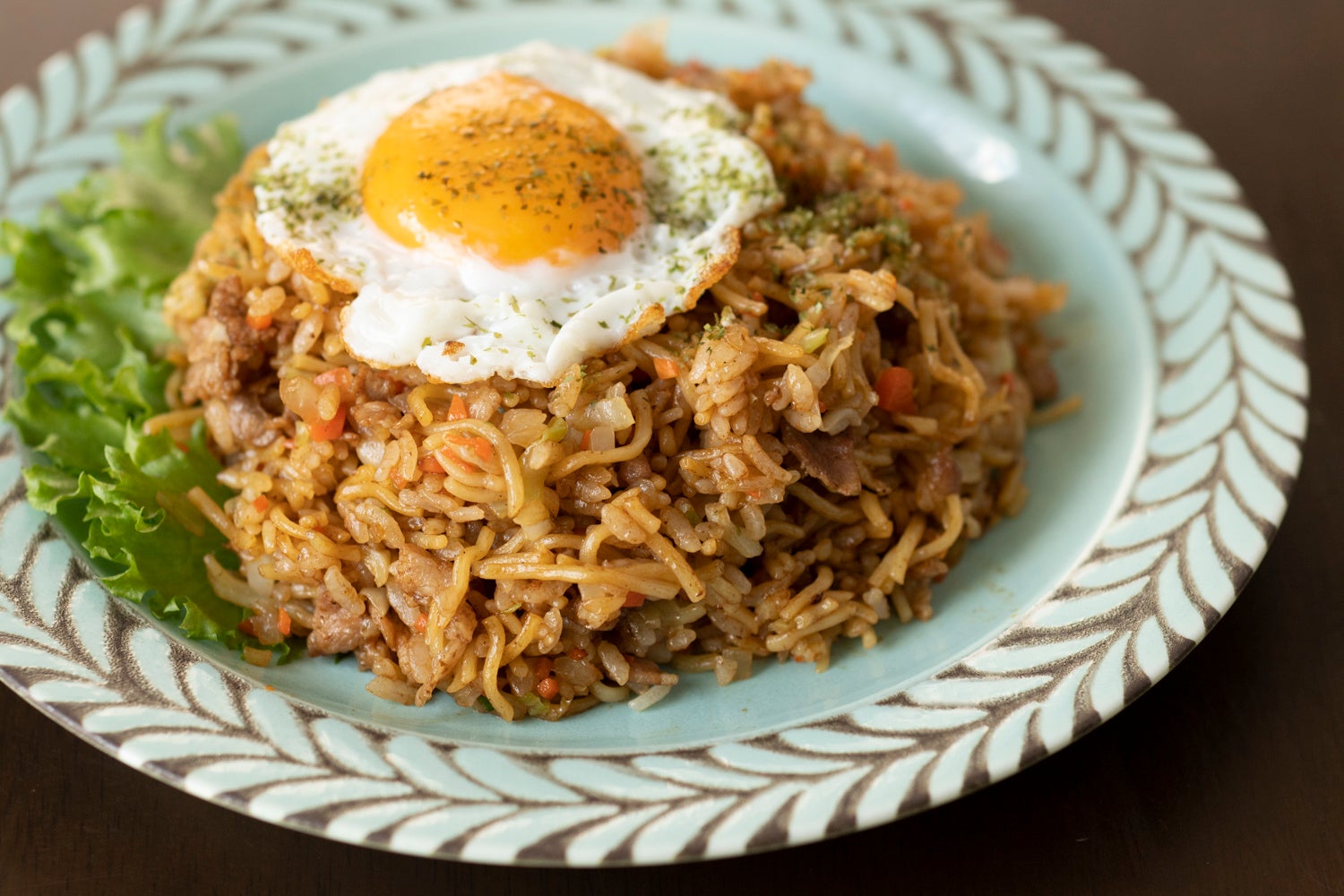 関西名物のそばめしも大盛りで作るのが夏子流。