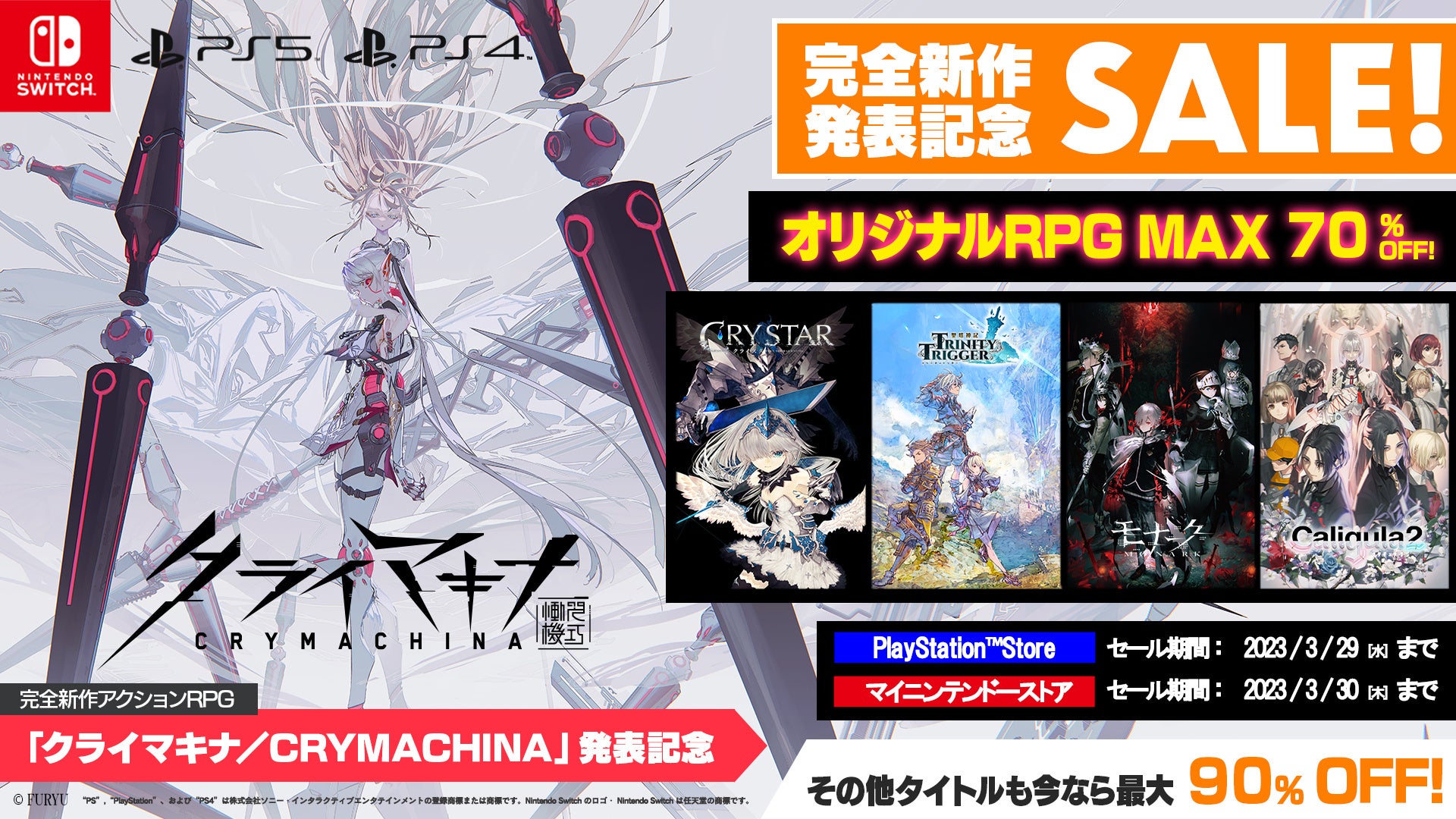 フリュー株式会社(本社:東京都渋谷区、代表取締役社長:三嶋隆、以下フリュー)は、Nintendo Switch™、PlayStation®4、PlayStation®5 にて発売中のゲームソフトにつきまして、ダウンロード版が最大90%OFFになる“『クライマキナ/CRYMACHINA』発表記念セール”を順次実施中です。本日3月16日(木)からは、「CRYSTAR -クライスタ- (デジタルアートブック付き版)」や「聖塔神記 トリニティトリガー デラックスエディション」等の、通常版よりも特典が豪華なデラックス版のセールを実施。お得な価格にてお買い求めいただけます。