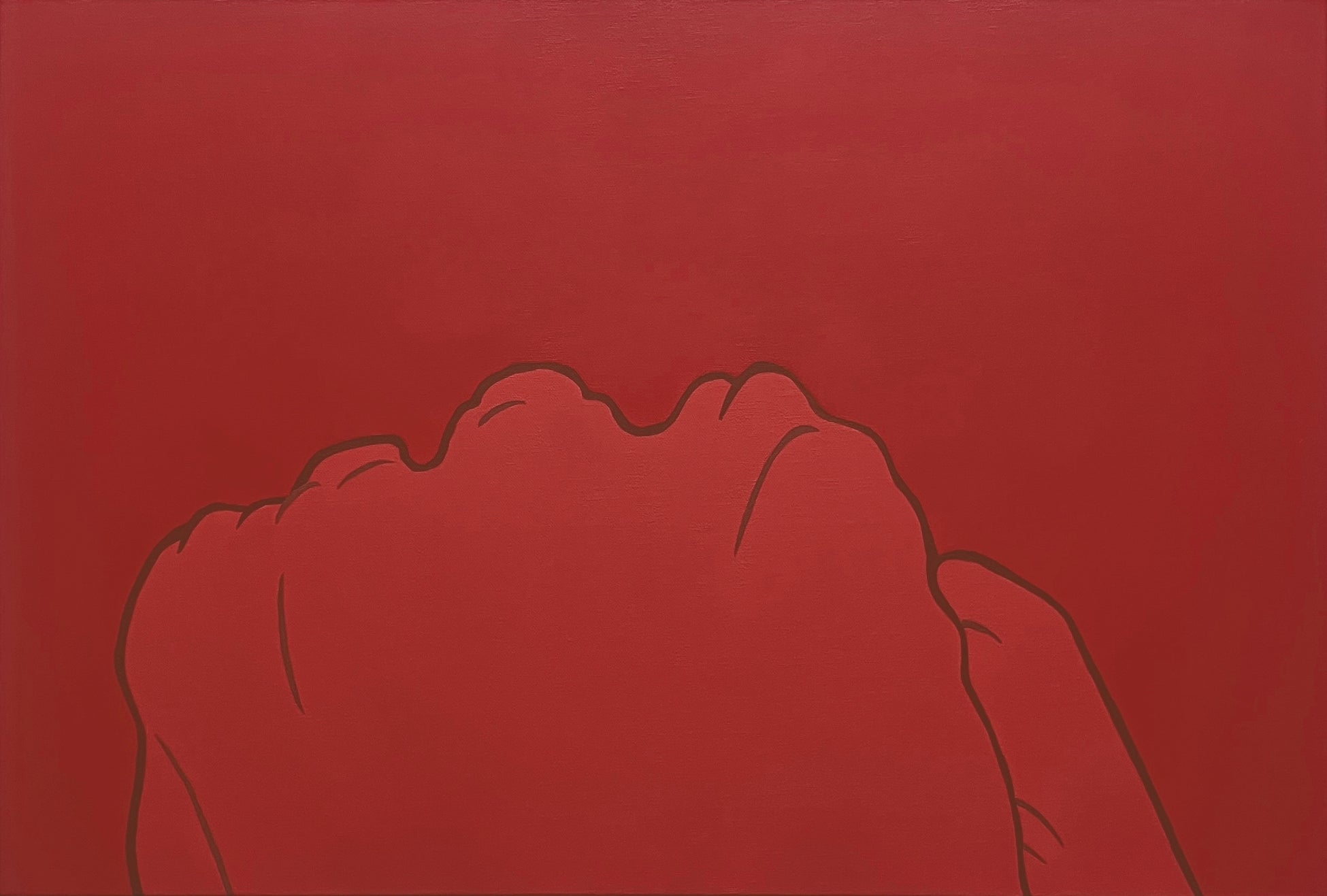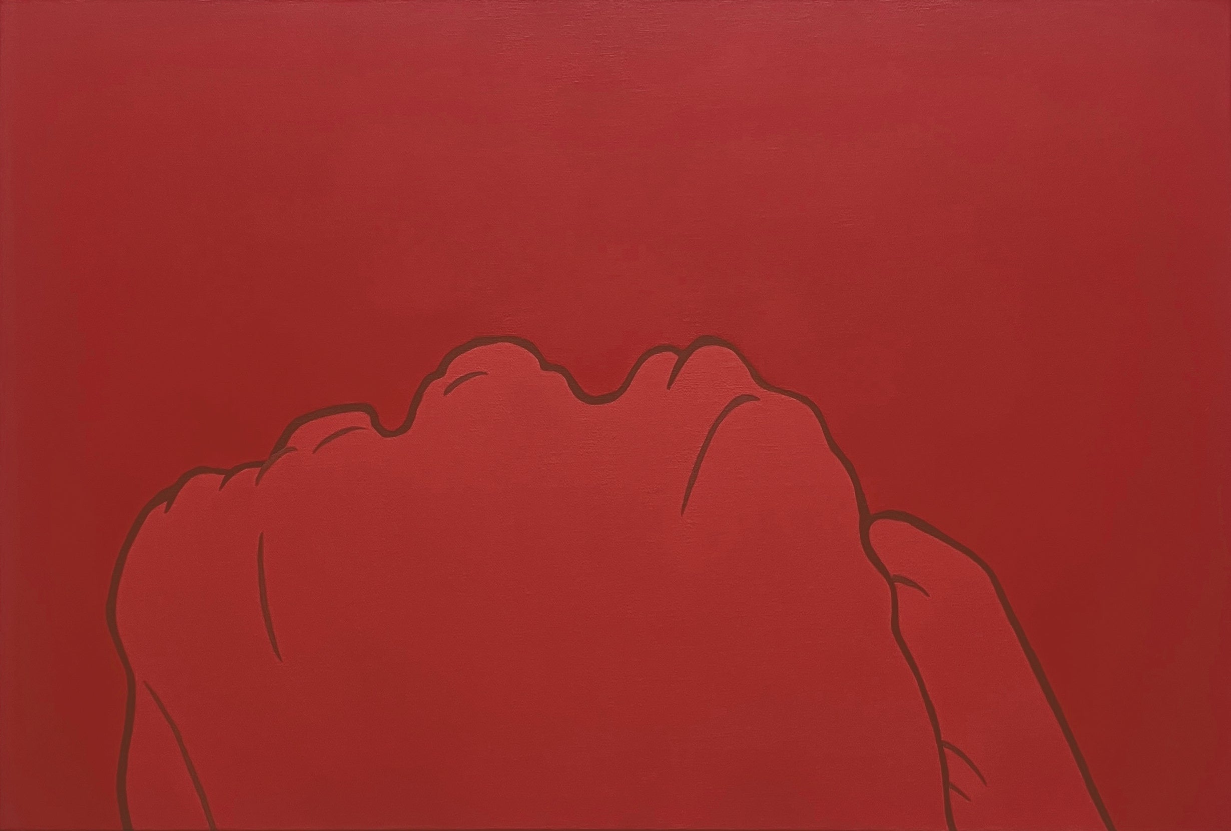 キャンバス上に引かれた線や重なり合う色彩は、身体の柔らかなカーブや起伏と呼応し、連なる峰や稜線のような風景を描き出しています。