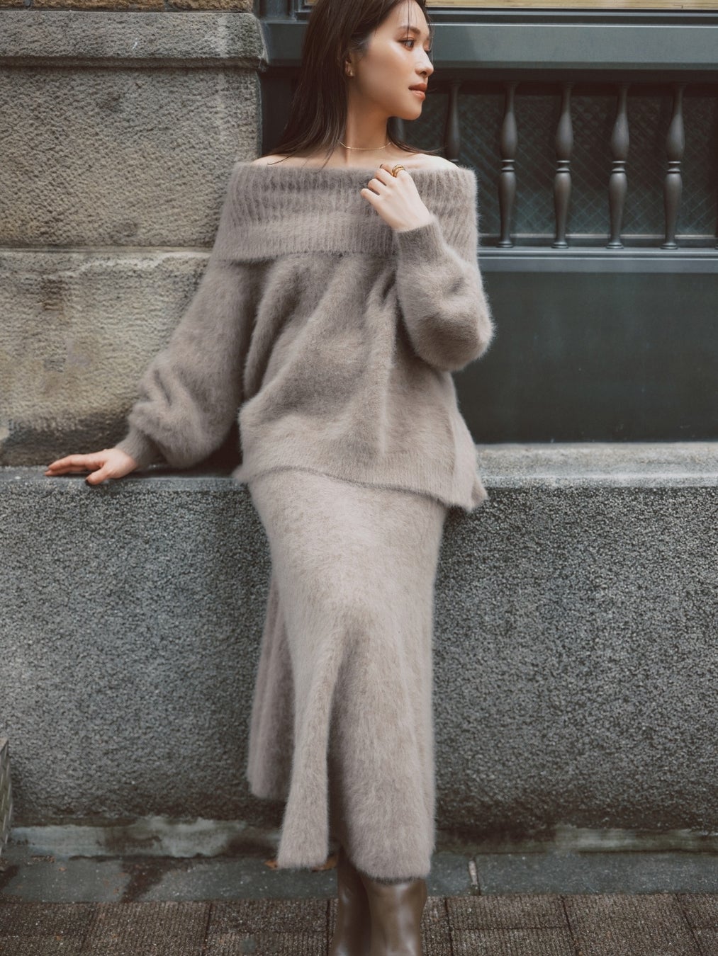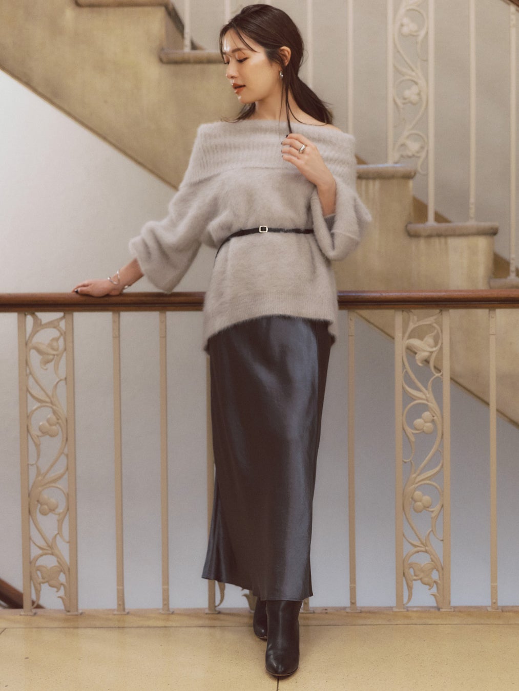 フォックス&カシミア混のオフショルダーニットは、今回のコラボの中でも個人的にいちおしのアイテム!包み込まれるようなふわふわの着心地で、上質な雰囲気たっぷりです。首から肩のラインが綺麗に見える上品なオフショルは、大人に最適。お尻が隠れるやや長めの着丈で、上からベルトをあしらってブラウジングしても素敵です。