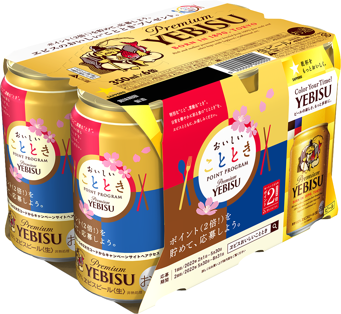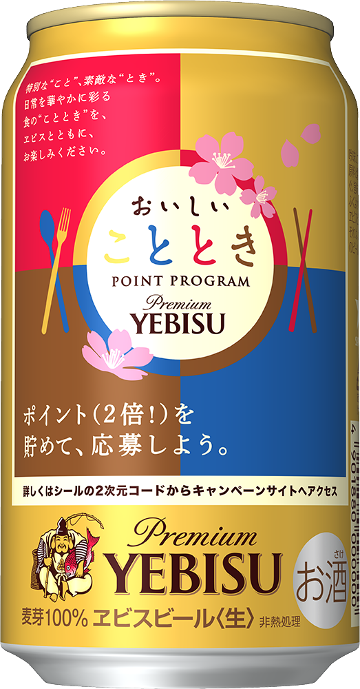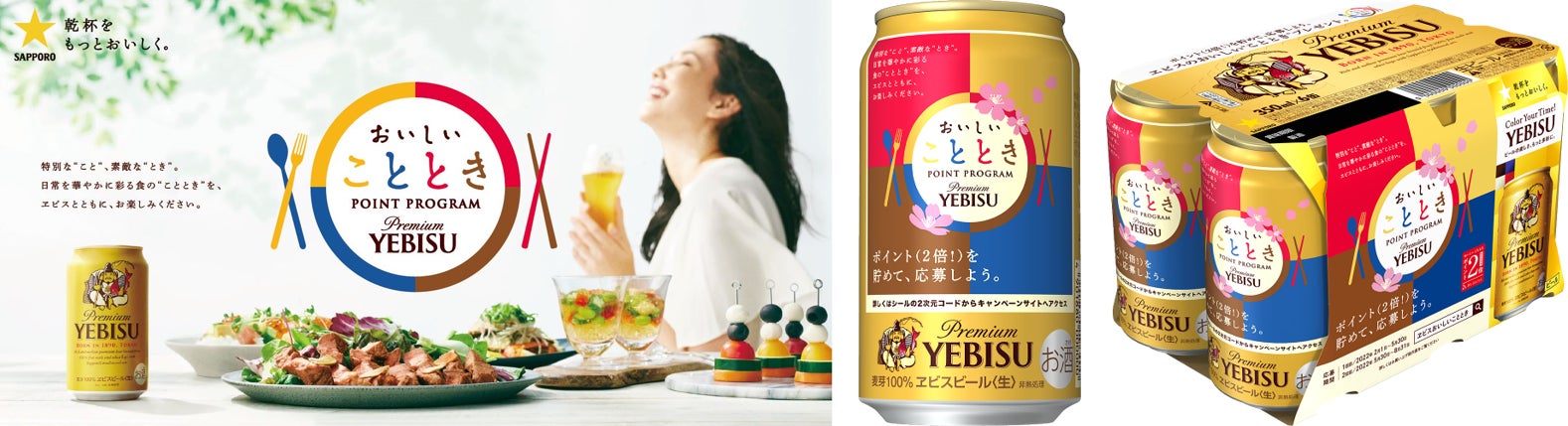 本キャンペーンは、対象商品の缶に貼付されたシールのポイントを貯めて応募いただくと、抽選で総計10,000名様に「ヱビスとの特別な“こと”、素敵な“とき”」が当たるキャンペーンです。3月15日には「ヱビスビール」「ヱビス プレミアムエール」のポイント2倍キャンペーンパックも全国で数量限定発売します。