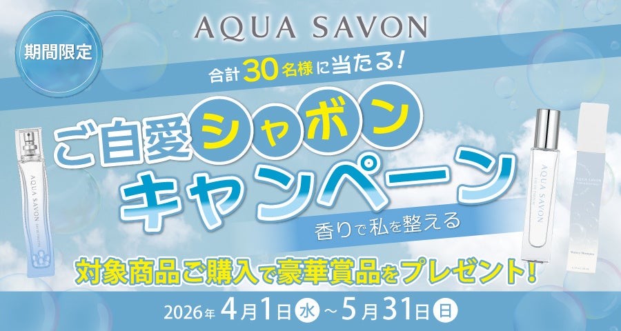 株式会社ウエニ貿易(本社:東京都台東区、代表取締役社長:宮上光喜)が展開する、やさしい香りのセルフケアブランド「アクア シャボン」は、対象商品のご購入で応募いただける「ご自愛シャボンキャンペーン」を、2026年4月1日(水)から5月31日(日)まで開催いたします。期間中、対象商品をご購入のうえ、レシートまたは公式オンラインストアでの購入完了画面を添付の上ご応募いただいた方の中から、抽選で合計30名様に賞品をプレゼントいたします。