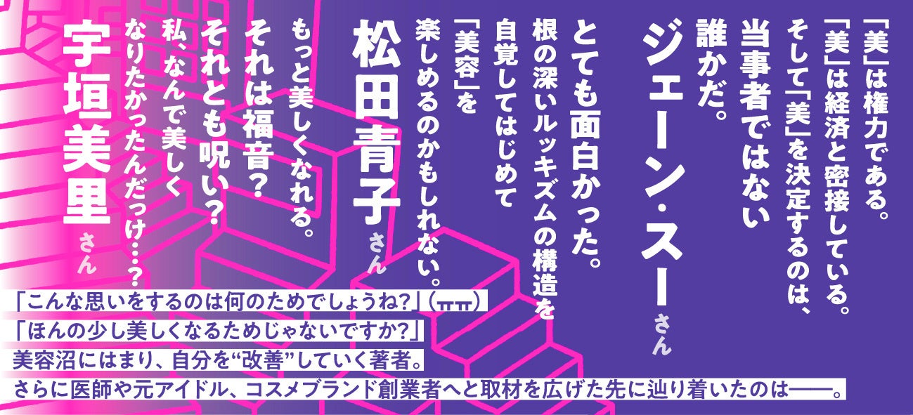 赴任先は「毛穴が存在しない未来」だった。光速進化のコスメ、肌を磨き上げる黄金ルーティン、世界一の美容整形ビジネス。たちまち美容沼にはまり、自分を〝改善〟していくアメリカ人女性記者。さらに医師や元アイドル、コスメブランド創業者へと取材を広げた先に辿り着いたのは――。体験と考察が融合したユニークな「美の帝国」滞在レポート、『美人までの階段1000段あってもう潰れそうだけどこのシートマスクを信じてる』は、2月17日(月)新潮社より発売です。