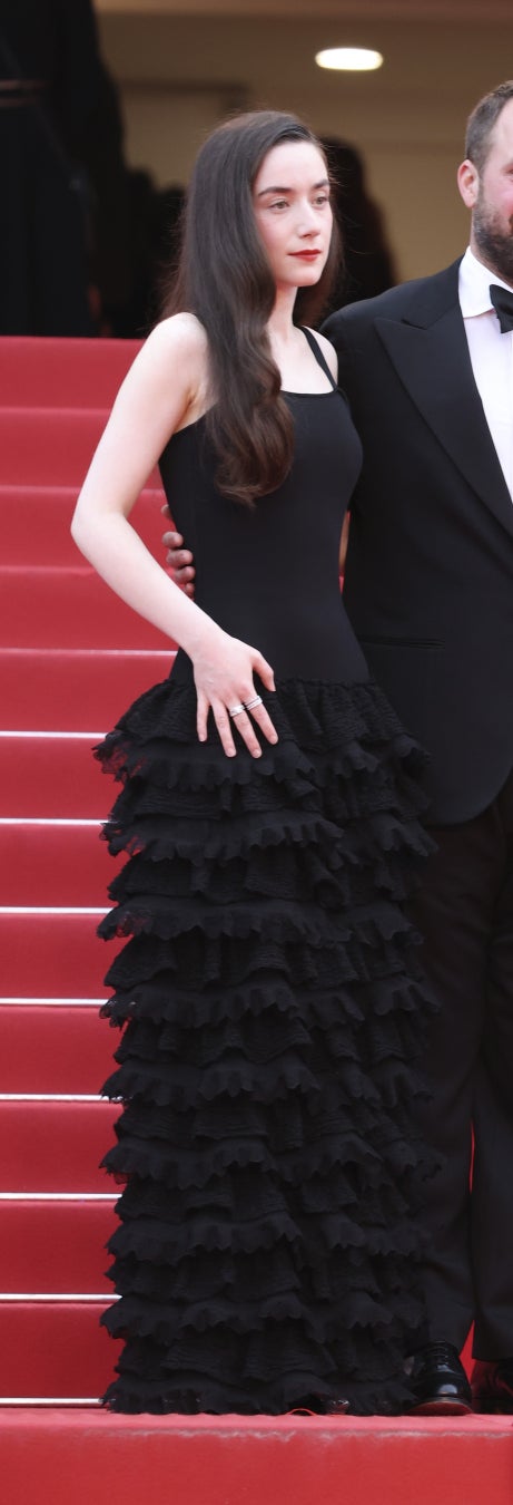 またレナーテ·レインスヴェは、映画「Sentimental Value(原題)」のフォトコールにブラックレザーのクロップドトップにサテンロングスカートと、ブラックとホワイトレザーのローファーを合わせました。