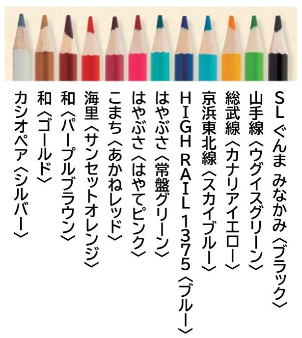 山手線、京浜東北線、はやぶさ、こまちなど、JR東日本の人気車両を集めたぬり絵ムック『JR東日本 鉄道ぬり絵BOOK』を2023年8月30日(水)に発売します。特別付録は、車両塗装カラーを再現した12色の色鉛筆セット(JR東日本商品化許諾済)。各色鉛筆に車両の名称がゴールドで印字された本誌限定アイテムです。