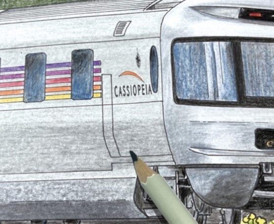 カシオペアのように鈍く光る車体の場合は、紙の白地を残さず、「カシオペア」色の薄い下地 ぬり部分を一番明るい色にします。