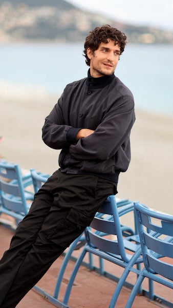 ルイ・ガレルは、「ディオール アイコンズ」 カプセル コレクションからネイビーのコットンとシルクのハリントンジャケットとブラックのウールパンツを纏いました。