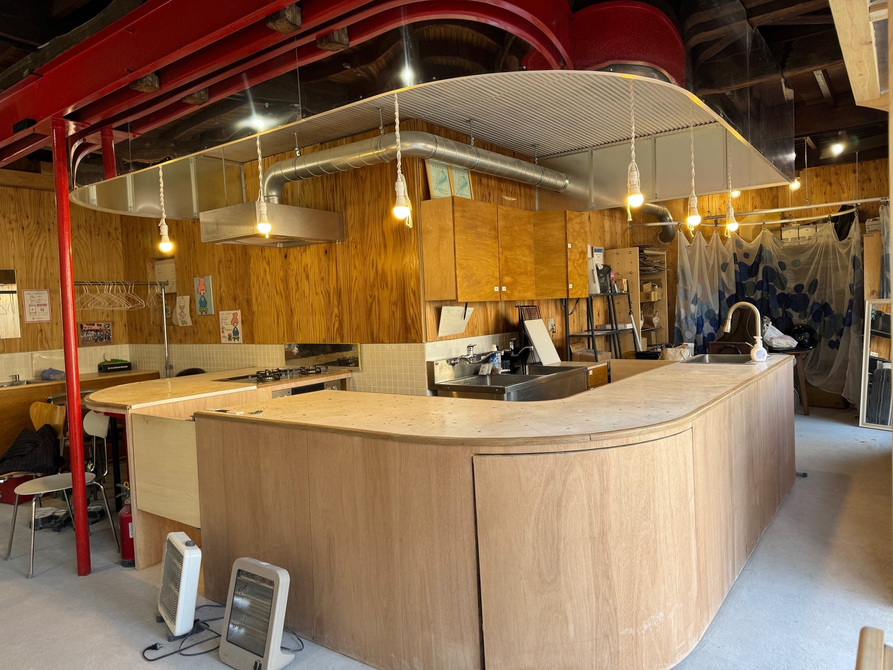 建物は地域に親しまれてきた旧精肉店としての記憶を継承し、空間の中心にキッチンを配置するとともに、道路側には全面開放可能な建具を採用し、建物内の活動や賑わいが自然とまちに滲み出る構成としています。