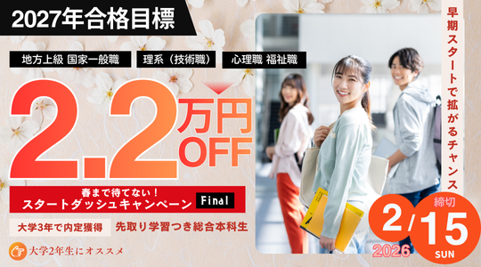 早めのスタートで、2026年度に実施される国家一般職(大卒)[教養区分]や自治体の最終合格を目指せる!