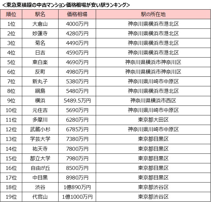 「東急東横線」沿線、中古マンション価格相場が安い駅ランキング TOP10は全て神奈川の駅がランクイン!