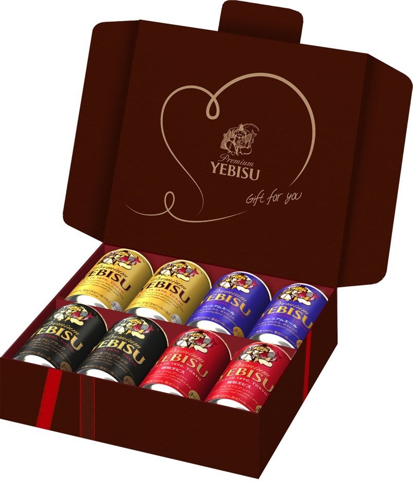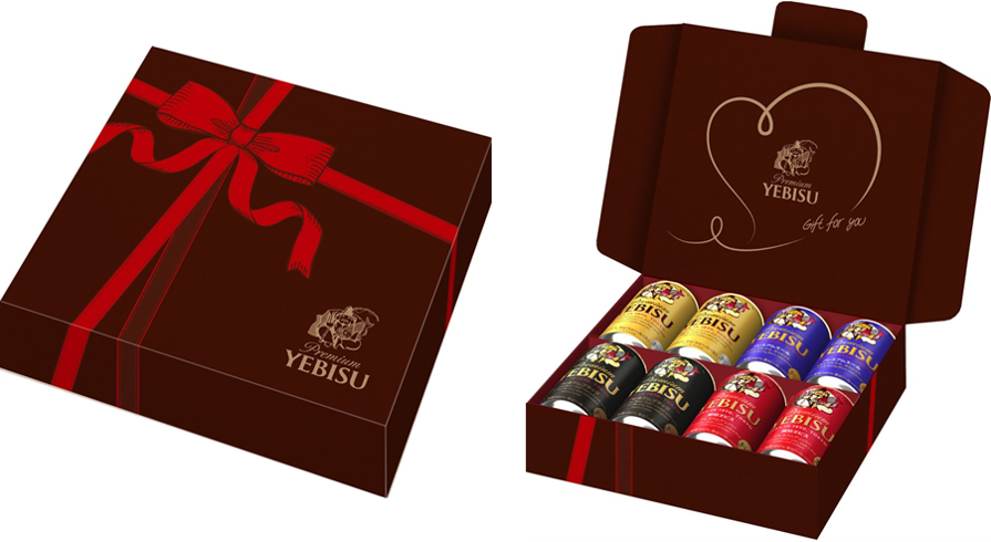 チョコレートギフトのようなブラウンのカートンにリボンのデザインをあしらった、ヱビス4種8本のバレンタイン向けカジュアルギフト