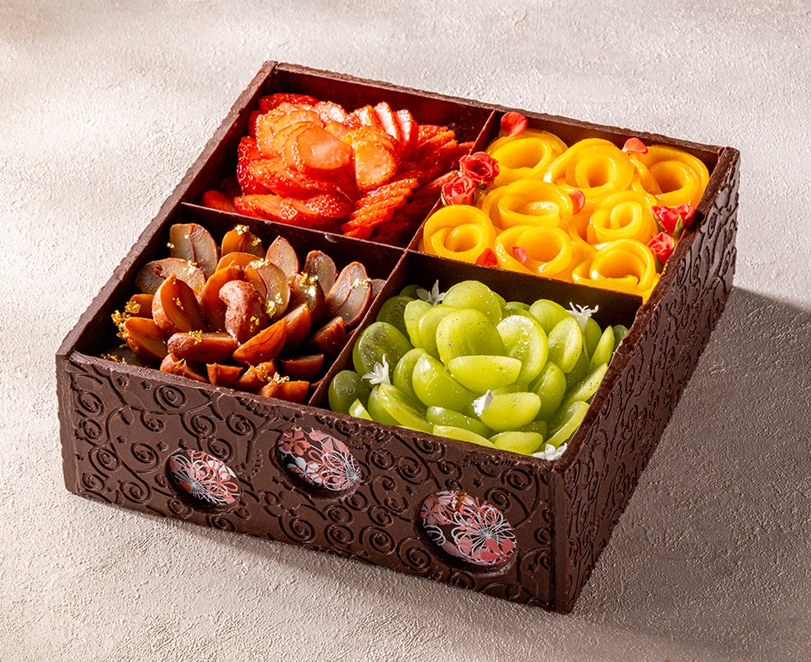 ベルギー産チョコレートで仕立てたラグジュアリーなボックスを開けると、色鮮やかな4種類のケーキが現れます。