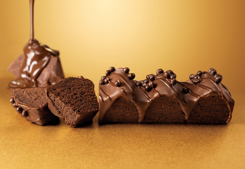 生地はねんりん家の冬の名物『マウントバーム ブラウニー』。うわがけのショコラは、炭⽕焙煎クーベルチュールをとろとろ溶かしこんだ、深いコクの“炭⽕ショコラ”。とろりと流しかけることで、外も、中も、ショコラづくしのバームクーヘンが出来上がりました。