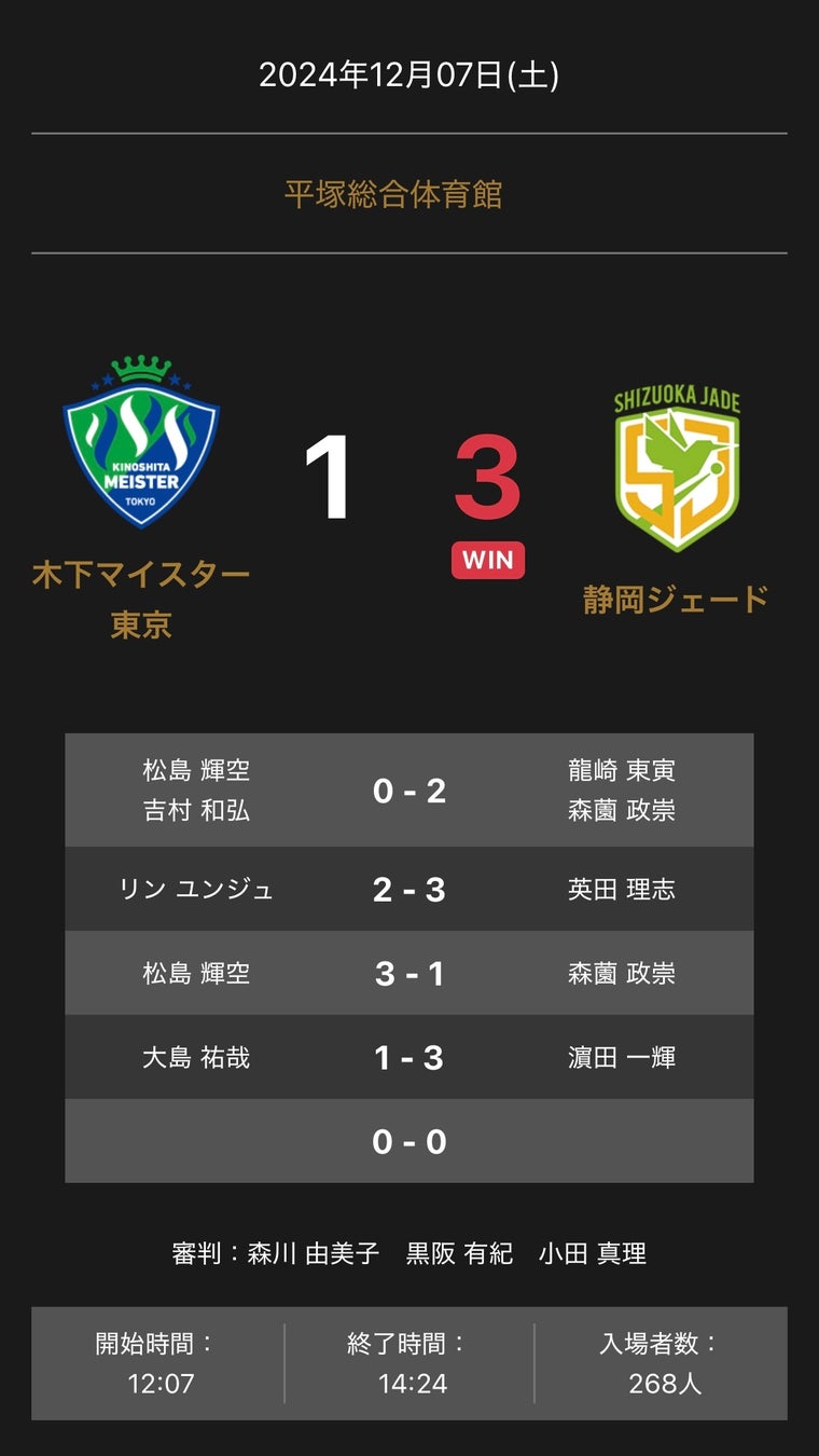 ノジマTリーグ 2024-2025シーズン 公式戦 12月7日開催 木下マイスター東京 vs 静岡ジェード 試合結果