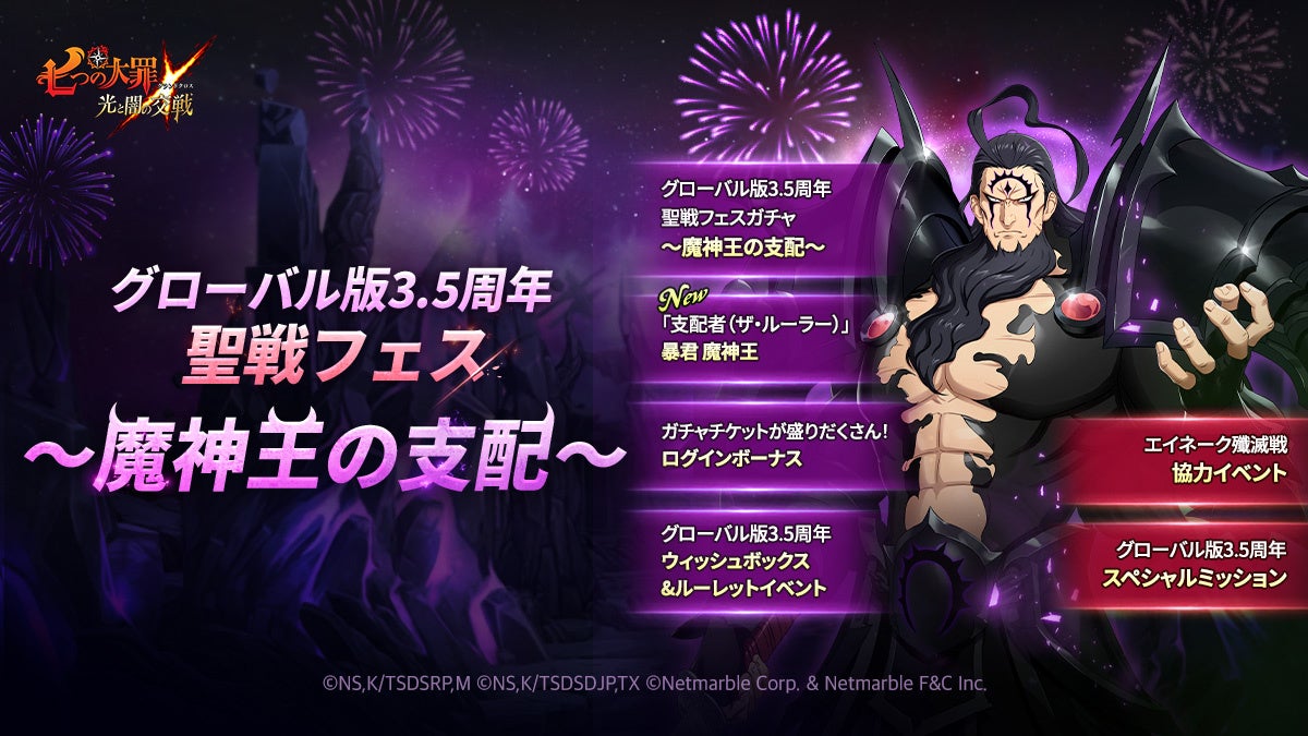 SSRキャラの出現率がアップする「グローバル版3.5周年 聖戦フェスガチャ~魔神王の支配~」から、新フェス限定キャラ「支配者(ザ・ルーラー)」暴君 魔神王が登場いたします。また、グローバル版3.5周年 聖戦フェスガチャからは、【呪いの絆】煉獄メリオダス、「殲滅状態(アサルトモード)」 暴走 メリオダス、【魔神王の代理】処刑人 ゼルドリス、【「閃光」の降臨】光の盟約 リュドシエル、〈うたたねの死神〉双剣士 キューザック、【歪められた闇】暴走 エスタロッサなどの聖戦フェス&グランドフェス限定キャラが復刻で登場いたします。