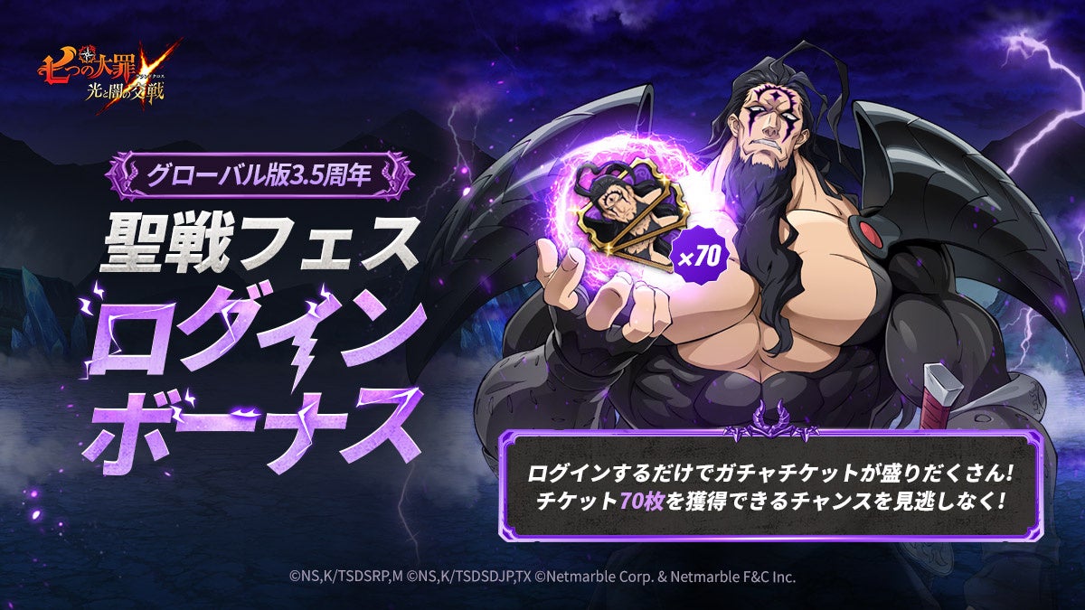 イベント期間中、ゲームにログインすることで、「グローバル版3.5周年 聖戦フェスガチャ ~魔神王の支配~」を最大77連分回せる、「グローバル版3.5周年聖戦フェスチケット」がもらえます。