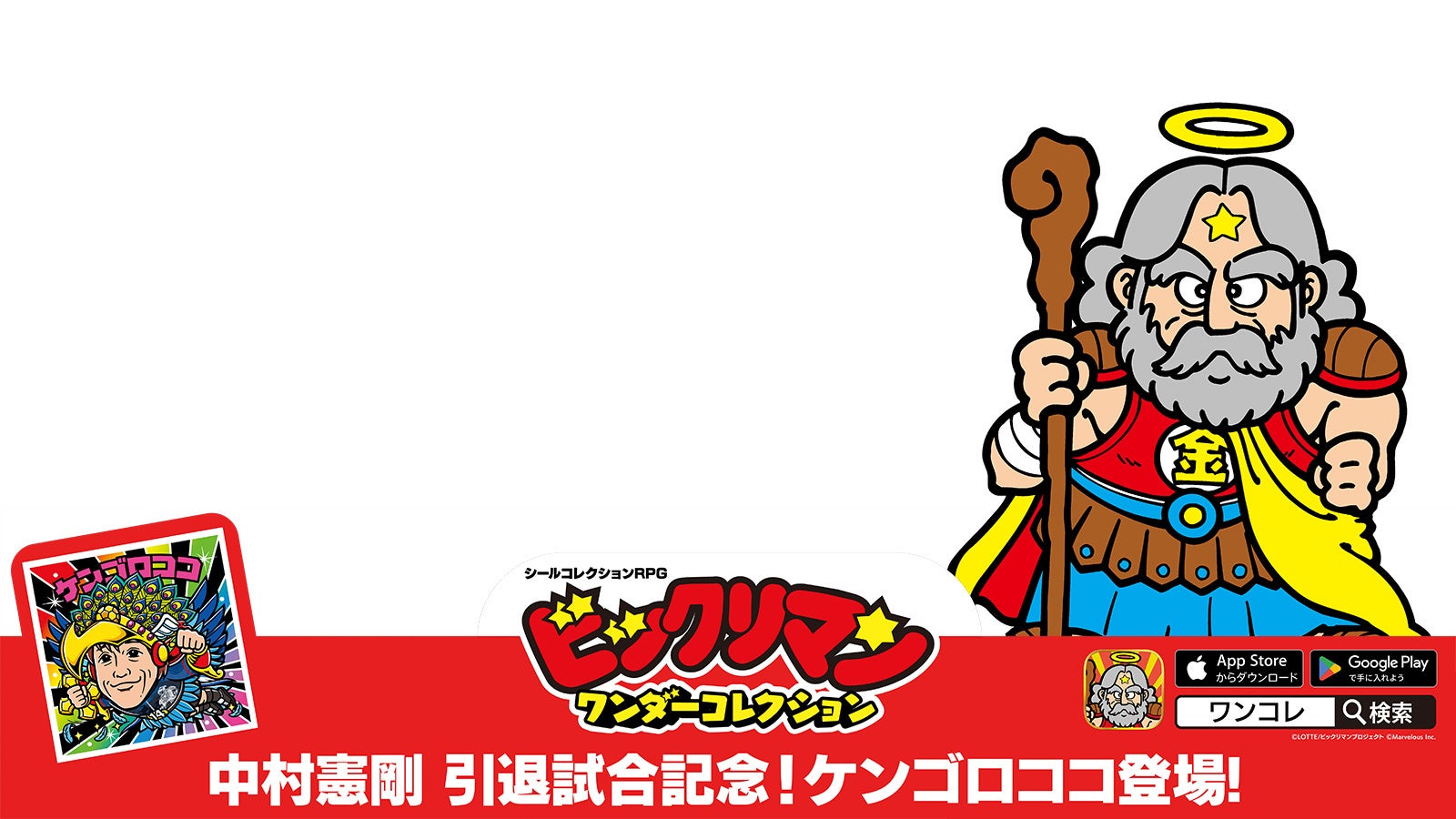 この度は、2024年12月14日(土)に開催される私の引退試合、「明治安田presents 中村憲剛 引退試合」にビックリマンブランドのチカラを貸して頂き本当にありがとうございます。また、シールコレクションRPG『ビックリマン・ワンダーコレクション』を運営している株式会社マーベラス様のお力添えにも感謝しています。