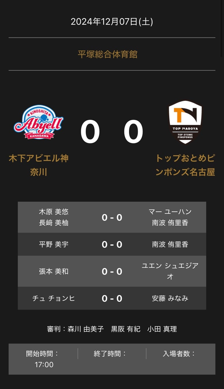 ノジマTリーグ 2024-2025シーズン 公式戦 12月7日開催 木下アビエル神奈川 vs トップおとめピンポンズ名古屋 対戦オーダー発表