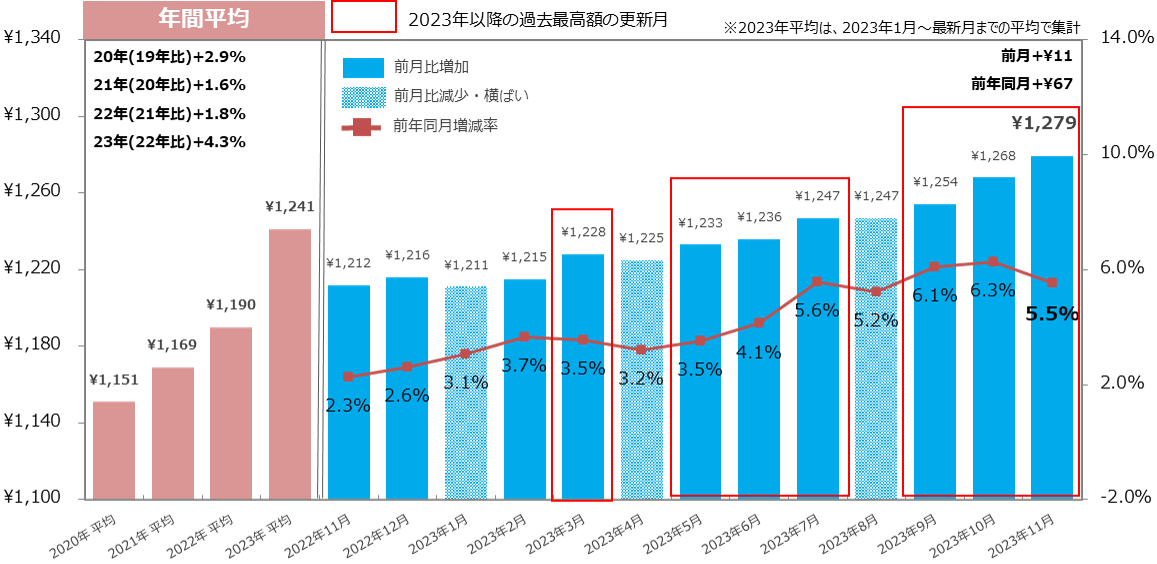 23年11月の三大都市圏の平均時給は1,279円で、前月比は11円の増加、前年同月比は67円の増加(増減率:+5.5%)となり、2023年に入り過去最高額を7回更新した。【図5】