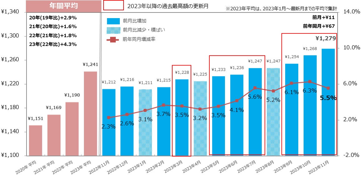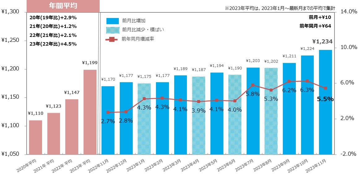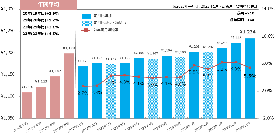 23年11月の全国平均時給は1,234円で、前年同月比は15カ月連続増加し、23年7月以降1,200円以上で推移。年末年始の繁忙期に向け[飲食・フード]は初めて1,100円を突破。