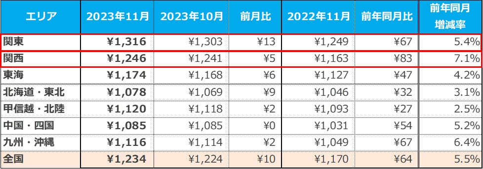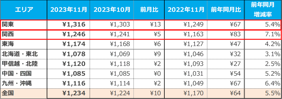 また、「関西」は1,246円で前月比5円の増加、前年同月比83円の増加(増減率:+7.1%)となり、全7エリア中で最も前年同月比が増加した。【図4】