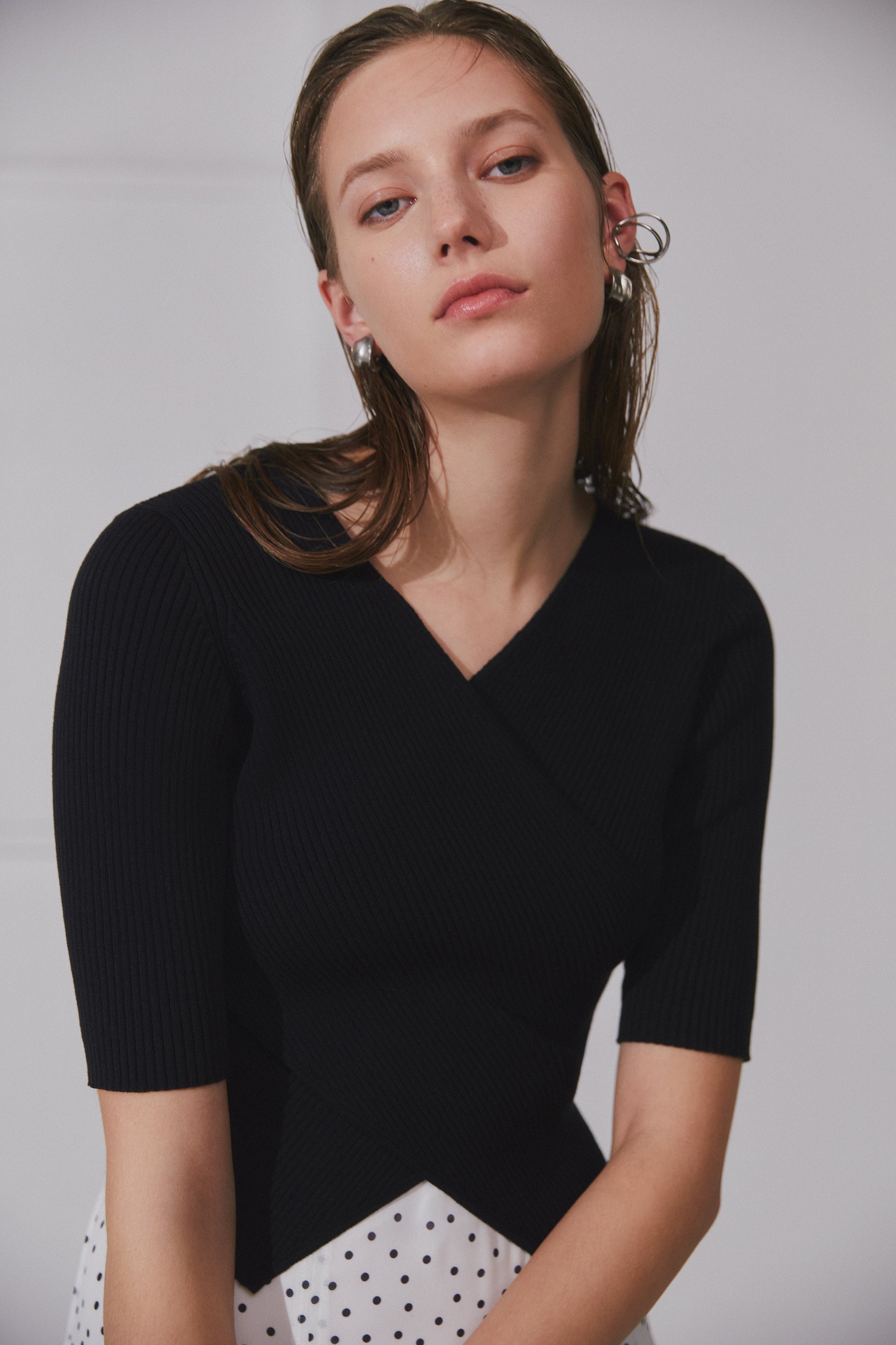 デコルテを美しく魅せるカシュクールリブニットと、裾に向かってボリュームが出るシアーフレアスカートで女性らしい印象に仕上げました。