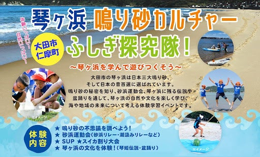 大田市の琴ヶ浜は、日本三大鳴り砂、そして日本の音百選に選ばれています。今回の体験学習は、鳴り砂の秘密を知る学習や、砂浜運動会やSUPなどのアクティビティ、そして琴ヶ浜で400年続く盆踊りの体験などを通して、琴ヶ浜の自然や文化について学ぶイベントです。メイン講師として、理科教育や環境教育で著名な島根大学の松本一郎教授を迎え、琴ヶ浜特有の自然環境や環境問題について学びます。