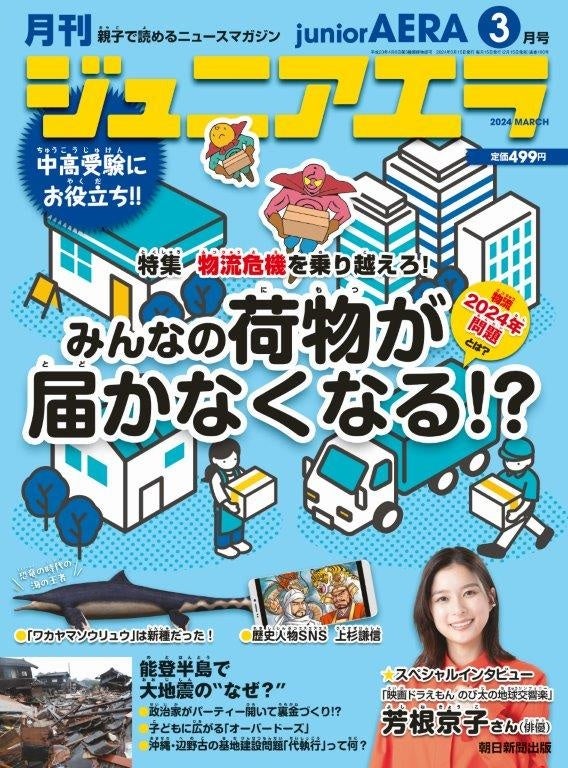 親子で楽しく読めて、中学受験・高校入試の勉強にも役立つニュース月刊誌「ジュニアエラ」3月号が、2月15日(木)に発売されました。特集は、「物流2024年問題 みんなの荷物が届かなくなる!?」です。ニュース解説は、「能登半島で大地震の“なぜ?“」、「政治家がパーティーで裏金づくり!?」などを掘り下げます。スペシャル企画として、3月1日公開の「映画ドラえもん のび太の地球交響楽」紹介+ミーナの声役・芳根京子さんインタビューも掲載!