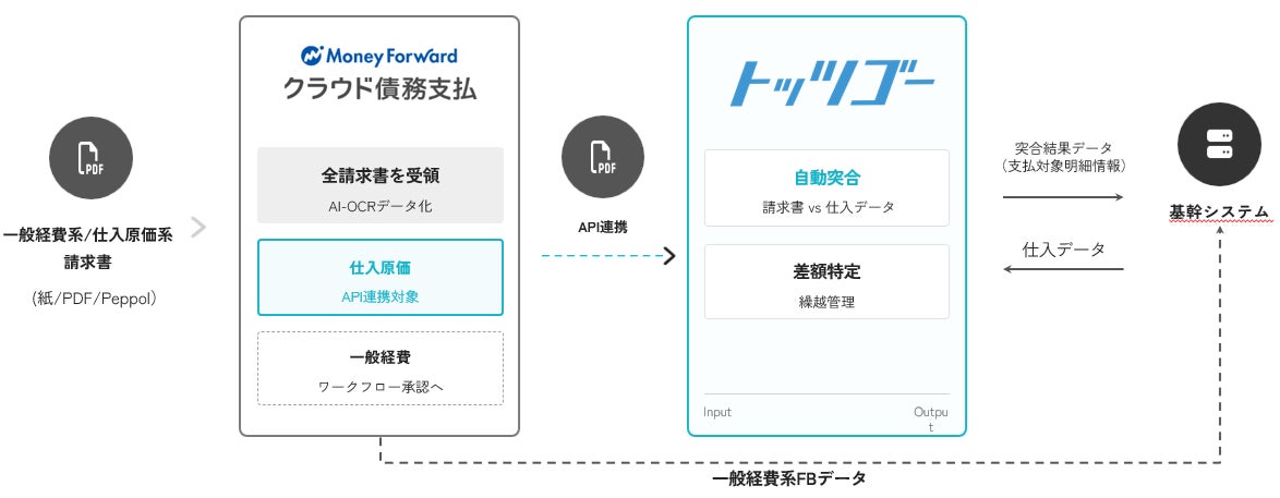 今回のAPI連携により、「マネーフォワード クラウド債務支払」で受領した請求データなどを「トッツゴー」へ連携し、請求データと仕入れ確定データの自動突合、不一致明細の確認、支払い申請、電子保管までの一連のプロセスをワンストップで実行できます。これにより、取引量が多く、原価の請求処理が複雑な製造・卸・小売業をはじめとした企業の経理担当者の請求処理工数を最大60%削減し、経理業務におけるペーパーレス化や、経理担当者の属人化の解消を支援します。