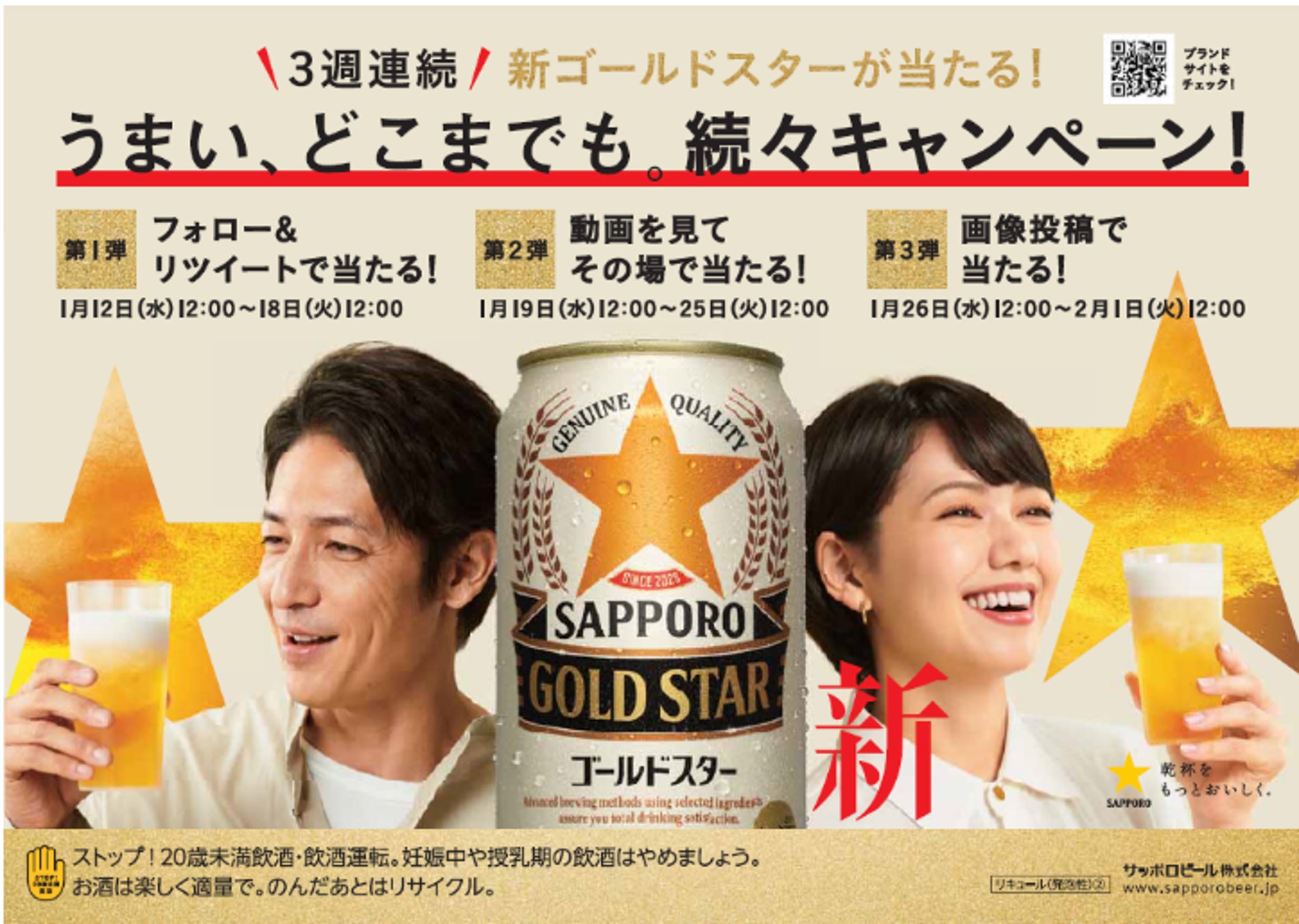 また、TVCM公開に合わせて、1月12日から3週連続で「サッポロ GOLD STAR」が合計10,050名様に当たる、Twitterキャンペーンを実施します。