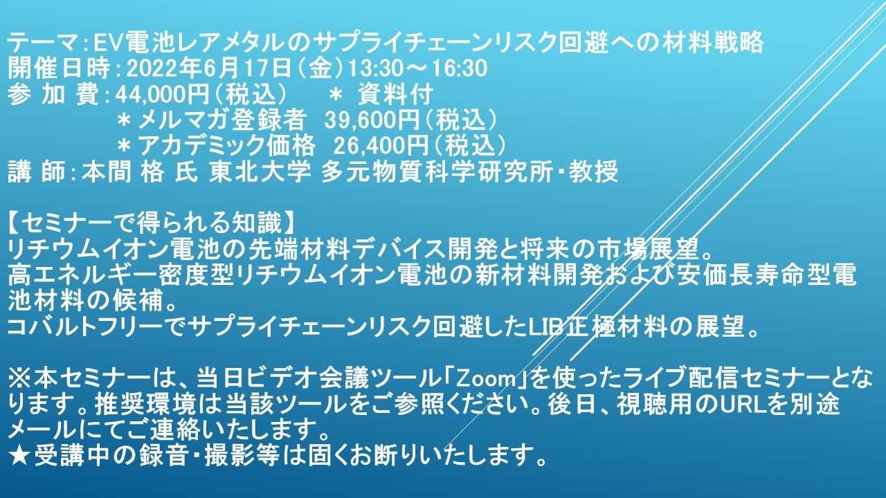 先端技術情報や市場情報を提供している(株)シーエムシー・リサーチ(千代田区神田錦町: https://cmcre.com/ )では、 各種材料・化学品などの市場動向・技術動向のセミナーや書籍発行を行っておりますが、 このたび「EV電池レアメタルのサプライチェーンリスク回避への材料戦略」と題するセミナーを、 講師に本間 格 氏 東北大学 多元物質科学研究所・教授)をお迎えし、2022年6月17日(金)13:30より、 ZOOMを利用したライブ配信で開催いたします。 受講料は、 一般:44,000円(税込)、 弊社メルマガ会員:39,600円(税込)、 アカデミック価格は26,400円(税込)となっております(資料付)。