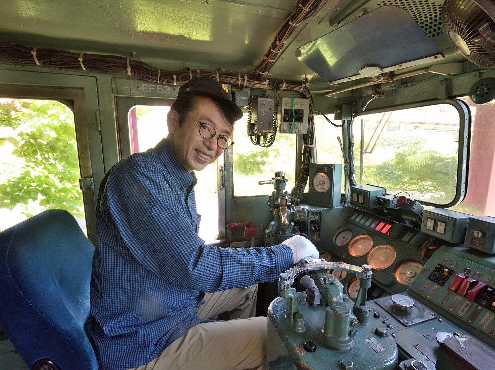 ▲日本の鉄道最大の難所だった碓氷峠の「峠越え」を追体験するフリーアナウンサーの福澤朗さん。電気機関車EF63形を動かすレバーを握り、運転士になりきる。