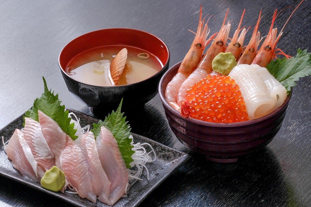 ▲青森から小樽へ、日本の鉄道史を五感で満喫する旅の締めくくりに、小樽市の『味処たけだ』にて海鮮丼を食す。甘海老、いくら、いかの三食丼とみそ汁のセット(2300円)に真ホッケの刺身(500円)を追加。