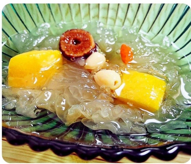 右)とろりとして透明な見た目も美しい“薬膳ジュレ”は、 白キクラゲをベースにハスの実やナツメなど、漢方食材を加えた台湾ならではのスイーツ。絶世の美女と言われた中国の楊貴妃も美容のために好んで食べたとか。