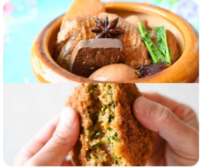 右)八角やローリエなどのスパイスが効いた醤油ベースの甘辛いたれで煮込んだ、台湾おでんとも言われる“滷味(ルーウェイ)”。鶏肉や大根など6種を盛り合わせました。また、ニラが入ったピリッと辛いメンチカツは、小腹が空いた時にも大満足!