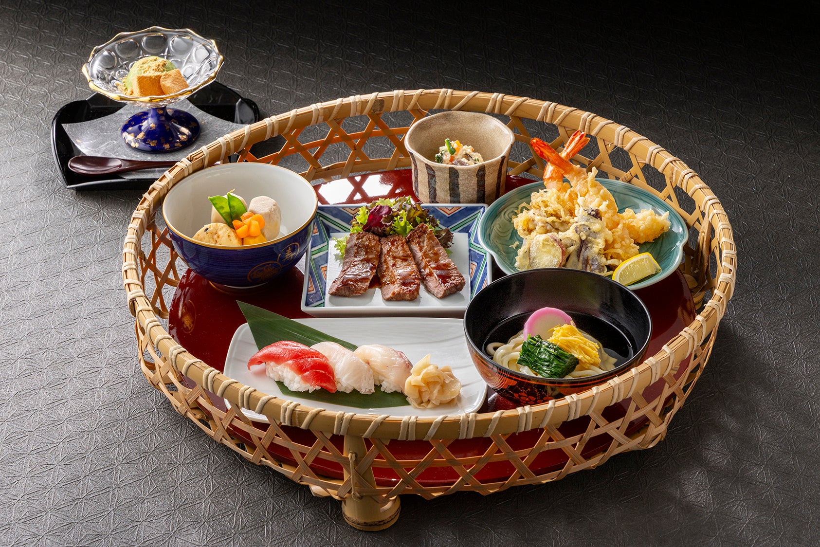 和食プランでは、「日本料理 松風」の料理長が腕を振るう、お寿司や焼き物、揚げたての天ぷらなどを美しく盛り合わせた籠膳をご用意しています。